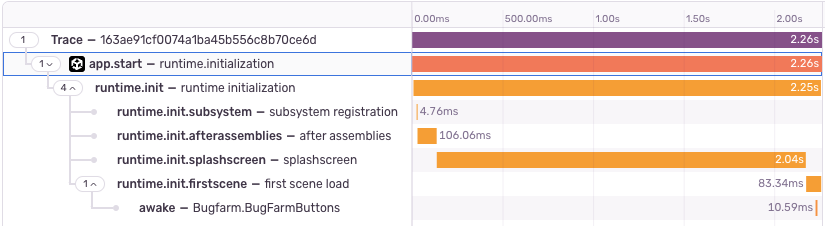 The Unity SDK automatically creates transactions for the game's startup and scene loading.