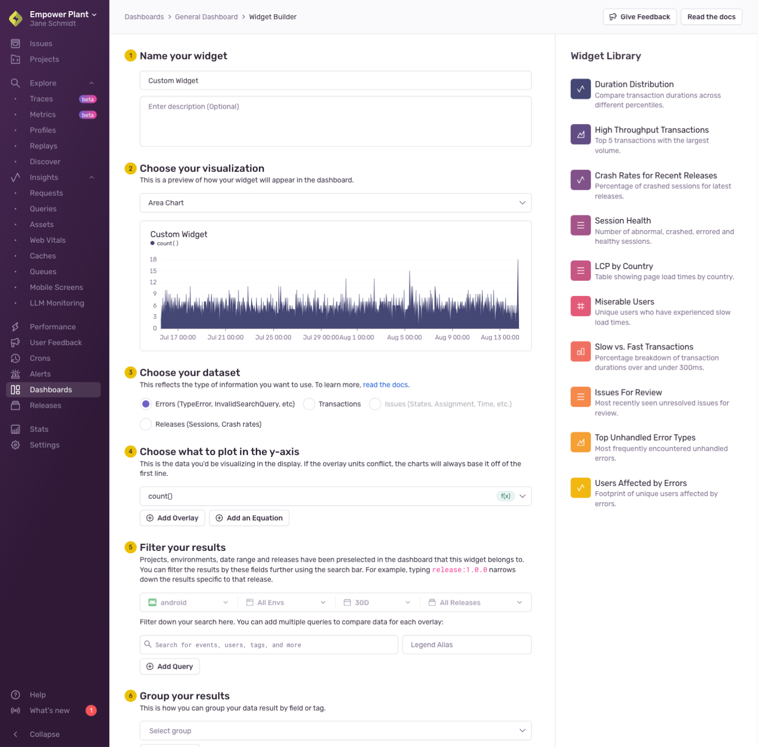 The widget builder has several configuration options that you can use to shape data and add information to your dashboard. These options are presented as steps in the widget builder, but you don't have to do them in the order they're presented in.